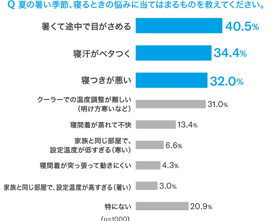 「続いて、夏の暑い季節、皆さんの寝るときの悩みとは何なのか?と聞くと、1番目は『暑くて途中で目がさめる』。2位は『寝汗がベタつく』、そして3番目が『寝つきが悪い』という結果でした。これは睡眠の質が悪いこと、そして睡眠休息感が乏しいということを示しているわけなんですね。特に暑くて途中で目が覚める、それから寝つきが悪いといったものは、夏に典型的に起こりうる睡眠障害です」(梶本先生)