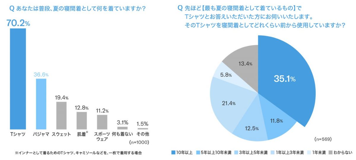 さらにアンケート調査では、3人に1人以上が10年以上着古した Tシャツで寝ていることが判明しました。普段、夏の寝間着として着ているものを尋ねたところ、「パジャマ」と回答した人が 36.6%であったのに対して、「Tシャツ」と回答した人は 70.2%に上ることがわかりました。また、夏の寝間着としてTシャツを最も着ている人の内、3人に1人以上が10年以上同じTシャツを着て寝ていることもわかりました。
