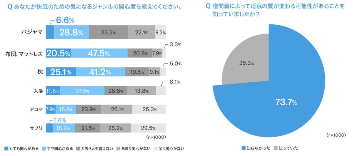 「布団・マットレス」(68.0%)、「枕」(66.3%)、「入浴」(49.3%)への関心は高かった一方で、パジャマと答えた人は 35.4%に留まりました。また、寝間着によって睡眠の質が変わる可能性があることを知らない人は73.7%に上り、パジャマと睡眠の質とが結びついていない人が多いことがわかる結果に。