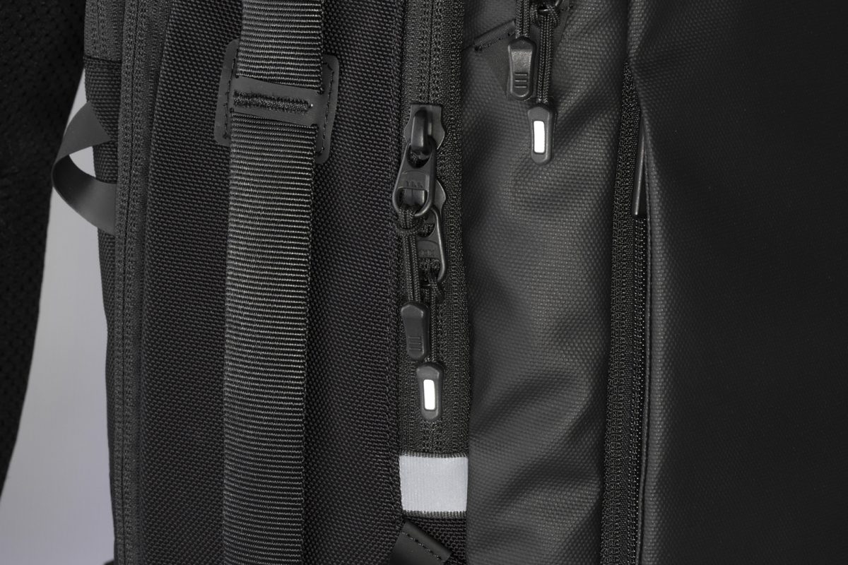 余分な装飾を省略し、都会のビジネスシーンによく馴染むデザイン。そのポイントは使用している生地からも感じ取ることができました。耐久性に優れるコーデュラバリスティックナイロンに、耐摩耗性を向上させる“PU加工”を施したコーティング生地を組み合わせることで、ビジネスにも合わせやすいキレイめ感がぐっとアップ。いかにもタフネスな雰囲気を出すことなく着用できるのは、現代のビジネスパーソンにとって大きなアドバンテージになるのではないでしょうか。(野田)