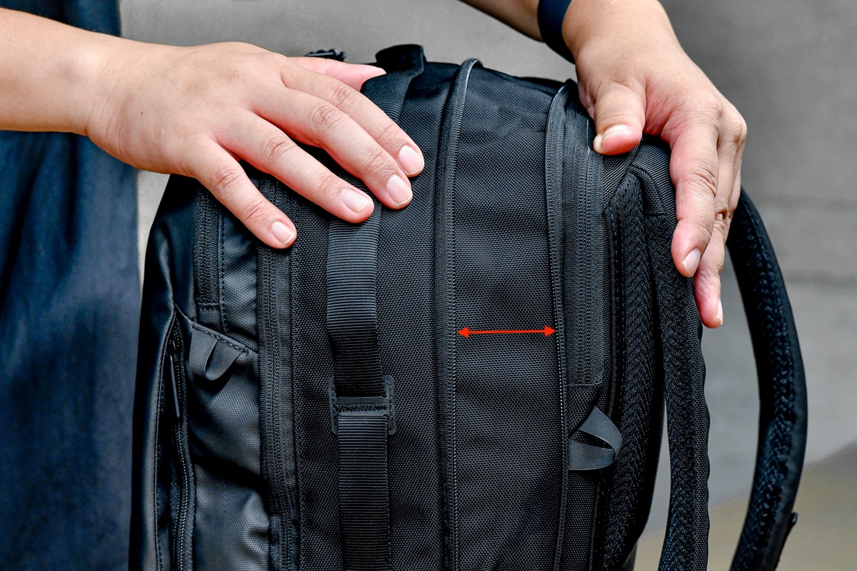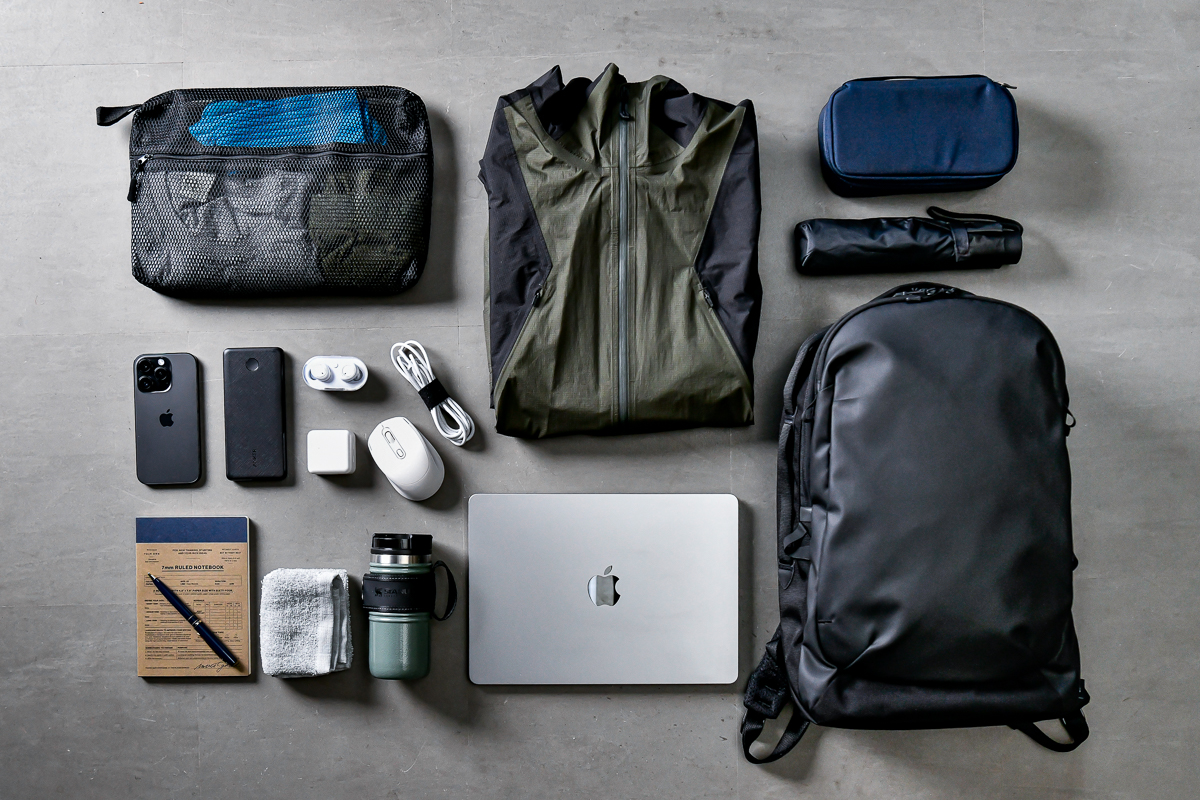 ↑1泊2日のビジネス出張を想定し上記の荷物に、アウターや着替え用の衣類、アメニティツール、折り畳み傘を追加しました。想像以上にスペースを埋めがちな衣類ケースを収納しても、まだゆとりがありました。これだけの荷物をパッキングしても、細かく整理できて素早くアクセスすることができます