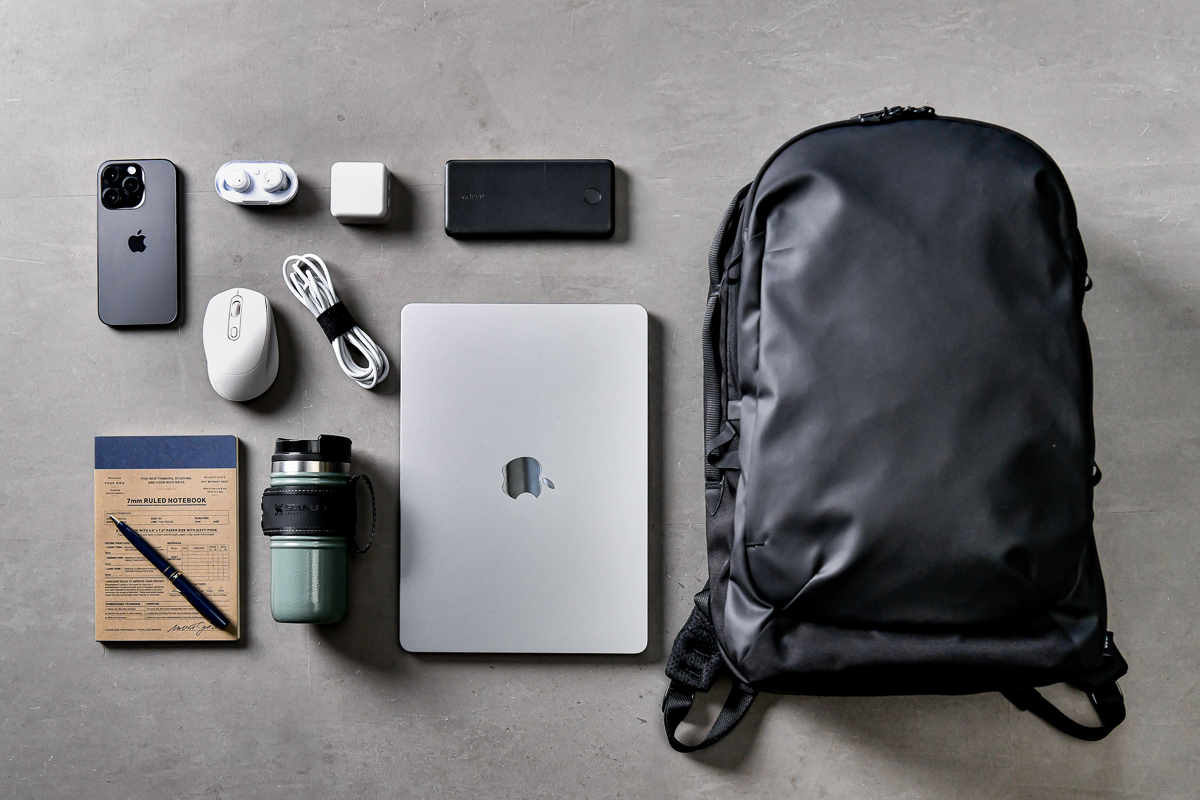↑ビジネスシーンを想定し、編集部員の日常に欠かせないツールを収納してみました。ノートPCや周辺機器、通勤時に使用するイヤホンなどのアクセサリー、筆記用具、メモ帳、ウォーターボトルの収納例がこちらです。メインやサブポケット内部には、仕切りやメッシュポケット、ファスナーポケットが備わり、かさ張りがちなコードや充電器など小物類も迷うことなく定位置に収納できそうです
