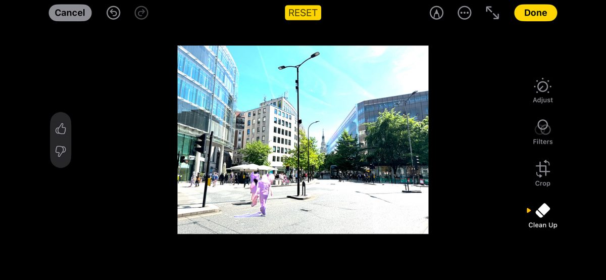 おすすめは「写真」アプリに新しく追加された「クリーンアップ」。言語環境を英語に変えなくても即戦力として使えます。写真アプリに保存した静止画データから、削除したい被写体を選択してきれいさっぱり消去する機能です。