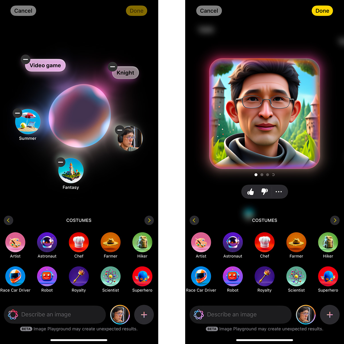 Image Playgroundは独立したアプリとしてiOSやmacOSに追加されます。人物のポートレートなどベースになる写真データを選んで、任意のキーワードを追加するとApple Intelligenceがちょっと気の利いた画像を素速く生成します。