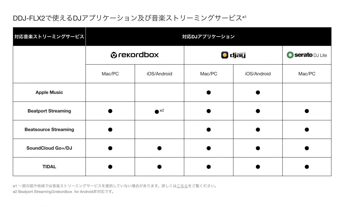対応する音楽ストリーミングサービスとDJアプリケーションは、画像の通りです。
