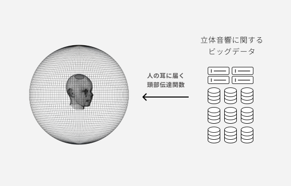 立体音響データベース:音波と両耳の関係にまつわる膨大かつ精密な実験データを元に、音に含まれる空間情報をスピーカーに付与することで、バイノーラル音源だけでなく、5.1ch音源や22.2ch音源なども立体音響として再現する