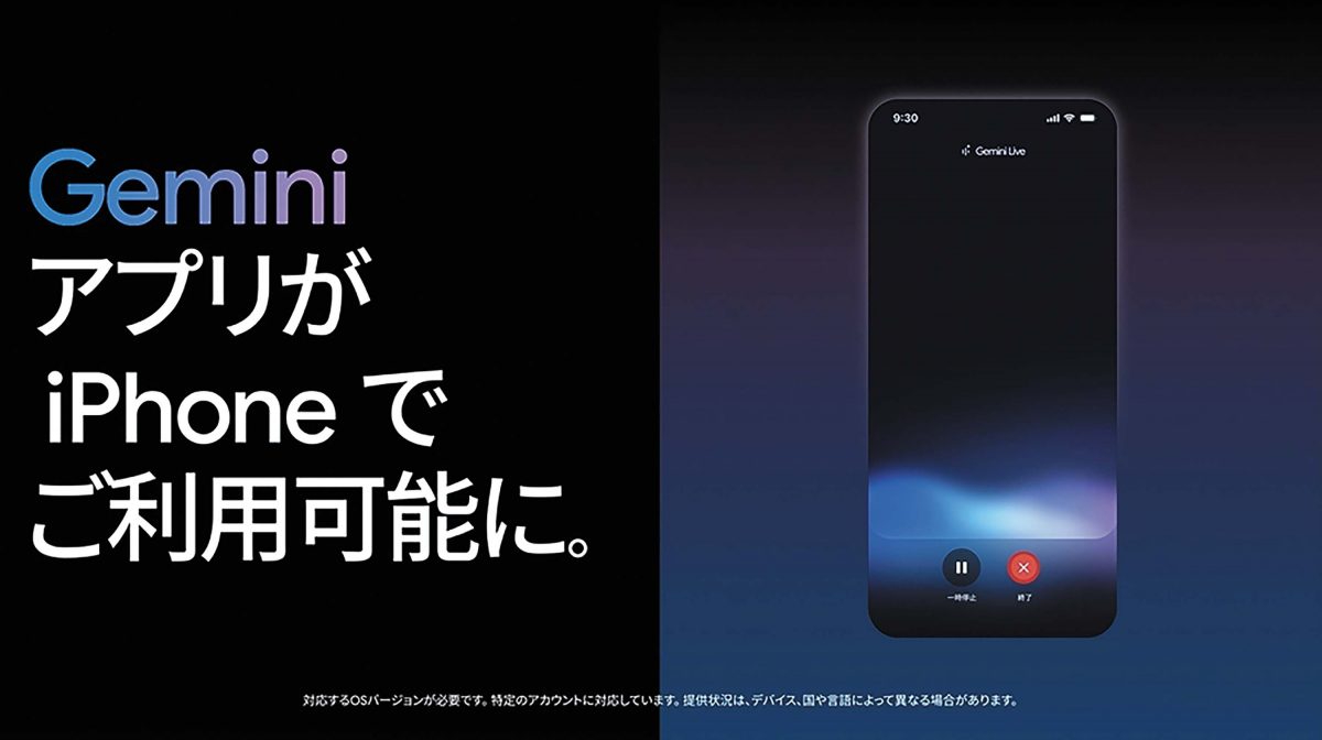 Googleは、AIアシスタント「Gemini」のiOSアプリを提供開始。iPhoneでもGoogle Live(日本語に対応)を使って、質問したり、Google検索やYouTube、Googleマップなどと連携し、チャットでGeminiと会話したりできる。