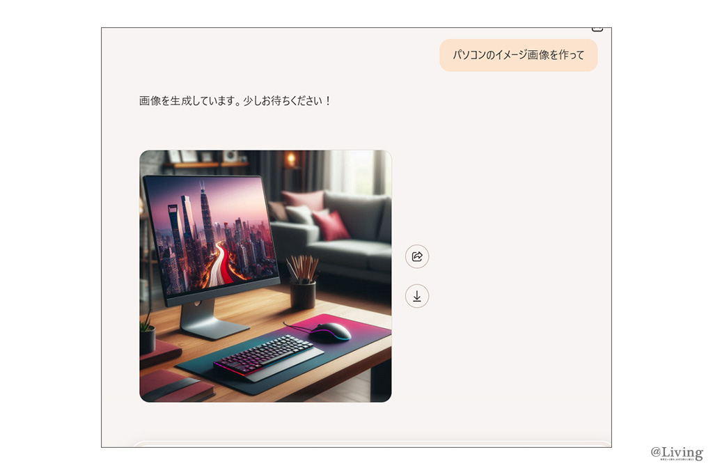 画像生成に関しても、「○○の画像を作って」とメッセージを送るだけで簡単に生成してくれます。