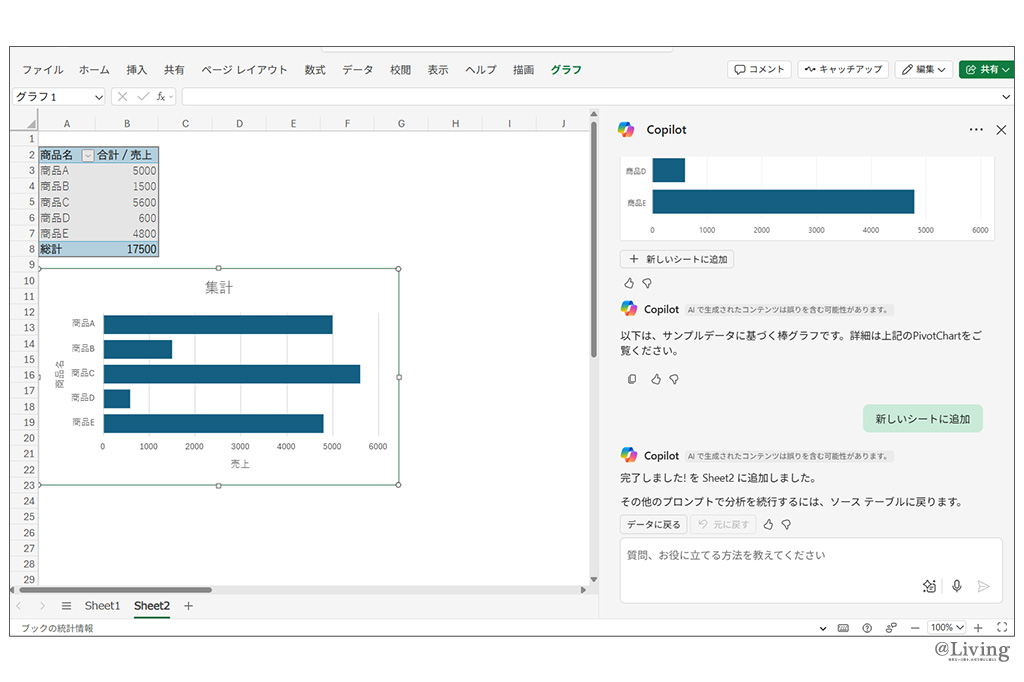 表だけでなく、グラフ作成もCopilotに頼めばあっという間に仕上がります。