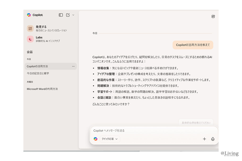 「『マイクの形のアイコン』(上記画像①)を押すと、Copilotに音声で質問することができ、Copilotも音声で返答してくれます」
