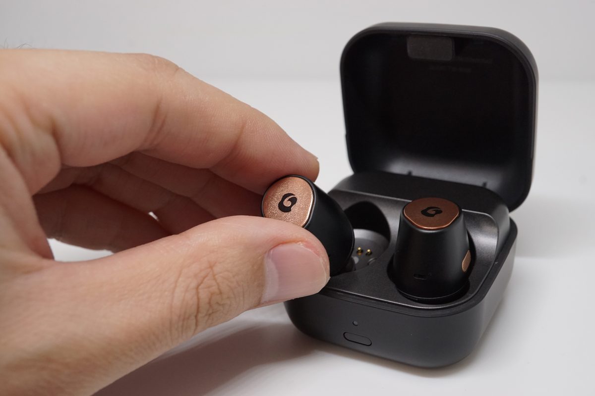 イヤホン本体はややシュッとしたデザインで、指でもつまみやすくなっています。付属のイヤーピースもやわらかくもちもちした質感でフィッティングも良好。ケースに収納する際のマグネットも強力で、着脱時も扱いやすい仕様です。操作はタッチパネルとなっており、タッチした際に「チャッ」と軽いSEが再生されます。レスポンスも良く、何回タッチしたかわからない……というようなタッチ操作のストレスはありません。