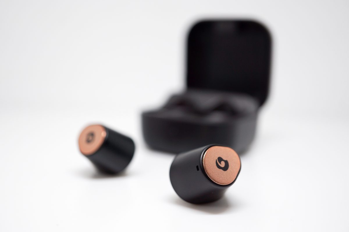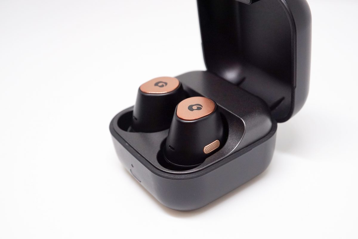 デザインはマットブラックを基調として、高級感のあるカッパーが差し色に使われています。パッと見た印象も派手すぎず、普段使いからビジネスシーンまで合わせやすそうなデザインです。イヤホン本体はIPX4の防水性能を備えており、急な雨や、運動時の汗なども気にせずに運用できます。連続再生時間は約8時間、充電ケース込みで約29時間の使用が可能です。10分間の充電で約2時間20分の再生が可能な急速充電にも対応しており、朝になってから充電のし忘れに気づいた! なんて場面でも安心です。