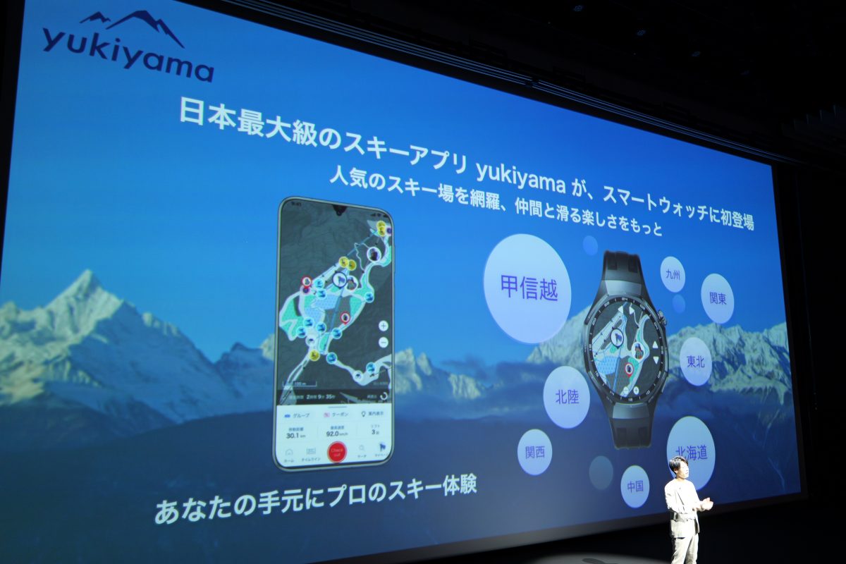 種目別のスポーツ機能も強化し、たとえばサイクリングでは漕いでいるときのパワーをシミュレーションする機能を搭載。また、スキーではスキー場の検索に加え、滑ったコースや距離・スピードなどを記録する「yukiyama」アプリを標準で搭載しています。