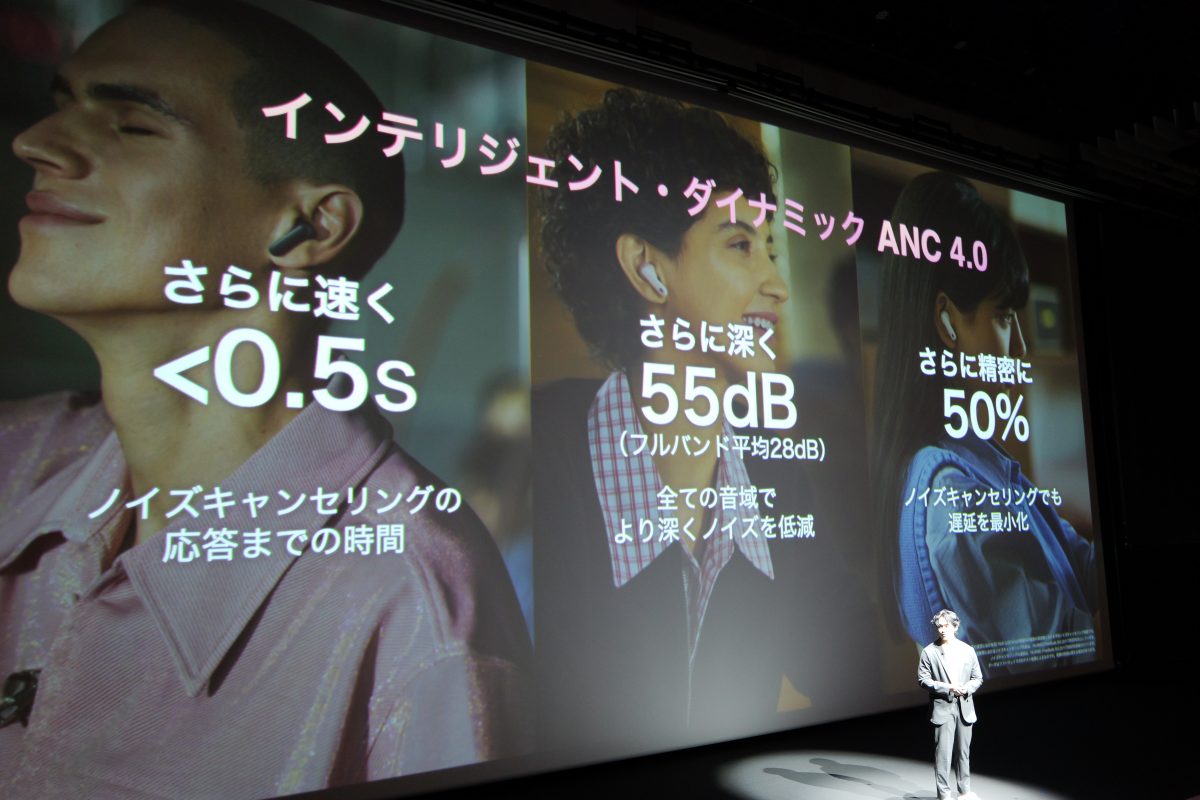 ノイズキャンセリング機能は、新たに「インテリジェント・ダイナミック ANC 4.0」を搭載しました。1つの内側マイクと2つの外側マイクでノイズを検知し、イヤホンに搭載されたプロセッサーがノイズを分析。そのうえでマイクが逆位相の音波を流してノイズを打ち消します。