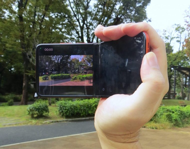 そして、本機種の大きな魅力の一つとして挙げられるのが、「カムコーダーモード」。カメラアプリを立ち上げた状態で端末を90度に折ると自動的にカムコーダーモードになり、昔のビデオカメラのようなポジションで動画を撮影することができます。一般的なスマホで横位置の動画撮影をしようとすると不安定ですが、この持ち方は非常に安定しており、スマホで動画撮影をする機会が増えそうなほど、優れた機能だと感じました。