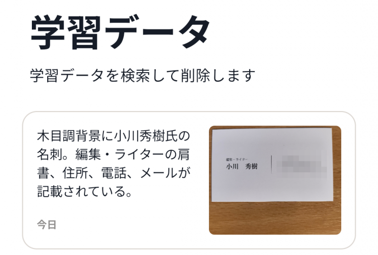 例として、自分の名刺を撮影して「お気に入りリマインダー」に学習させてみました。すると、以下のように名刺の内容が認識されました。