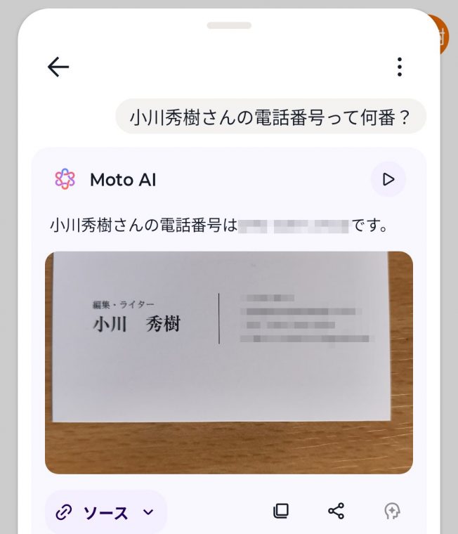 この状態でmoto aiの「質問と検索」に話しかけ、「〇〇さんの電話番号って何番?」などと話しかけます。すると、読み取ったデータから正確に電話番号を答えてくれました。