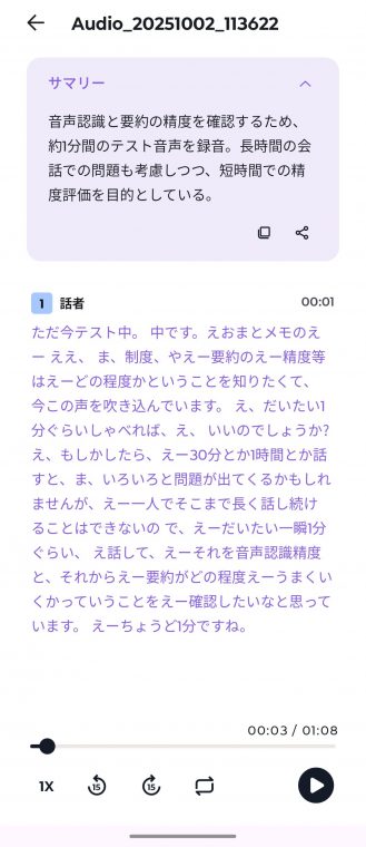 1分程度の音声を実際に録音してみたところ、認識精度は十分で大きな間違いはありませんでした。要約は簡潔かつしっかりとまとまっており、重要部分だけを抽出して短時間で大まかな内容を掴みたい場合は、大きな力になってくれそうな機能です。