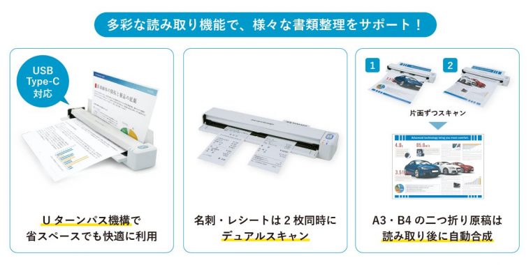 いつでもどこでも使えるモバイルスキャナーに最新モデルが登場。USB Type-Cに変更され、より使いやすくなっています。専用ソフトやクラウド連携サービスも便利。また、ユニークなデザインが揃うオリジナルカバーにも注目です。