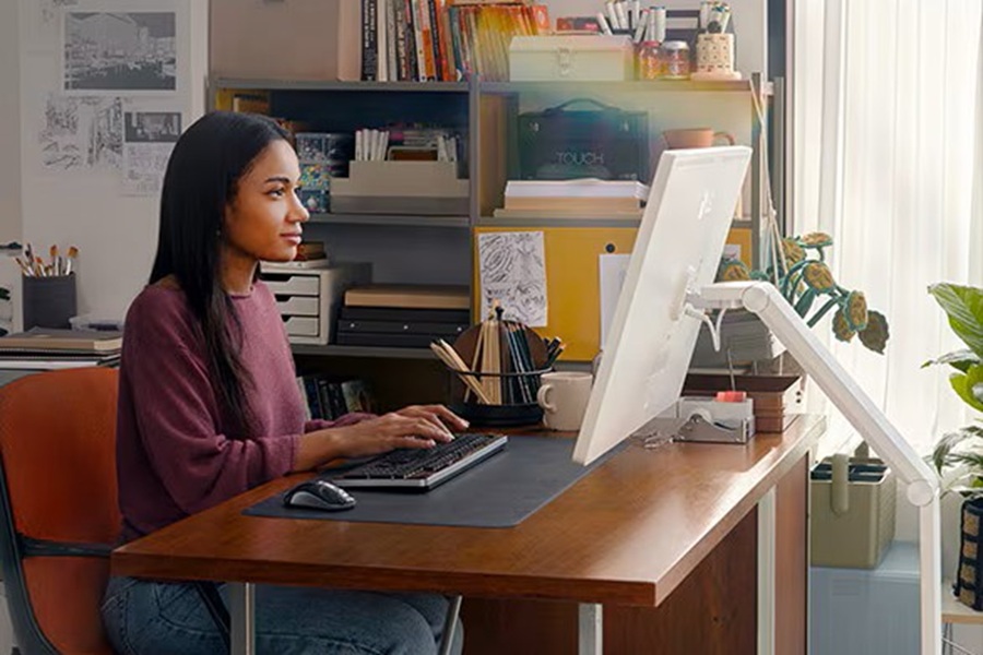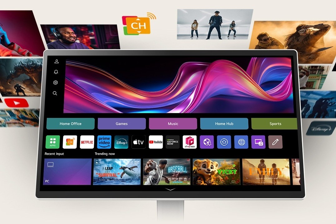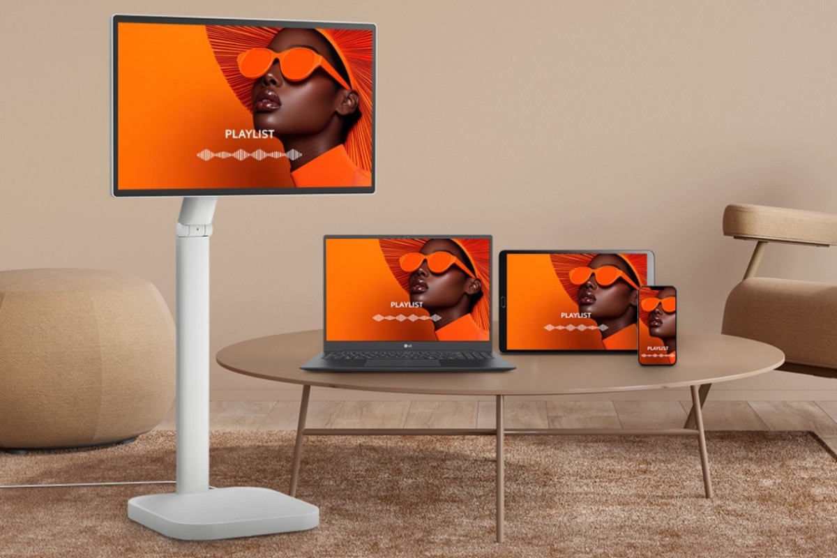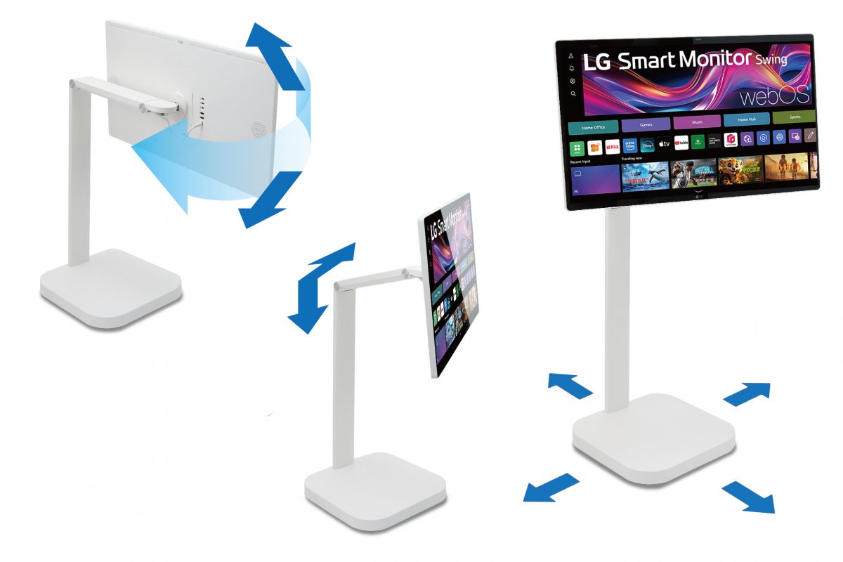 本製品は、LG独自のwebOSを搭載し、ネットに接続するだけでネット動画やサイトのブラウジングが行えるスマートディスプレイ。最大の特徴は、画面の位置を自在に調整できる可動式フレキシブルスタンドを採用していることで、これによりデスクワークからソファに座っての動画視聴まで、オンオフ問わず幅広いシーンで活用できる。