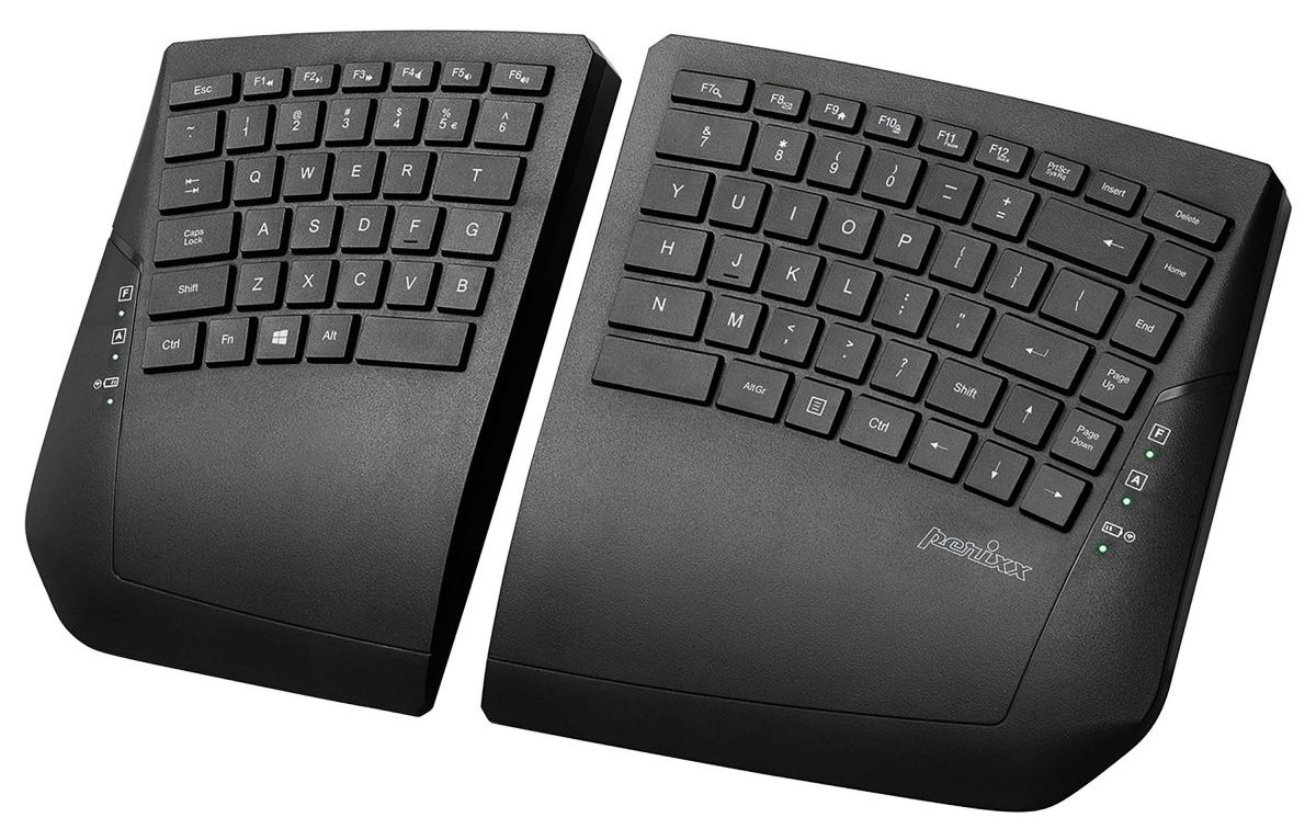 接続ケーブルや充電コードが不要のパームレスト付き左右分離型キーボード。肩幅に合わせて左右幅を調整でき、腕を最適な位置でキープできる。付属のスタンドを使えば、左右それぞれの角度を細かく調整可能。薄型で静音のメンブレンスイッチを採用している。