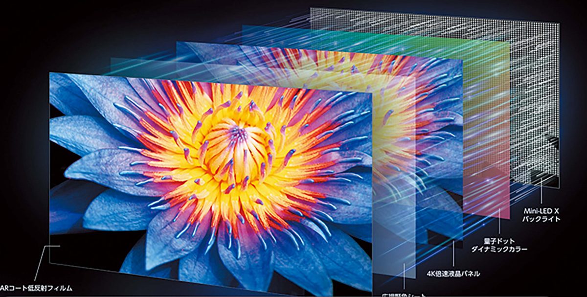 ミニLEDバックライトと量子ドットを組み合わせた「4K ADS液晶パネル」搭載のフラッグシップモデル。有機ELに迫る鮮明な黒を実現する「ARコート低反射フィルム」を新採用し、自然光の当たる明るいリビングでも鮮やかな映像が見られる。