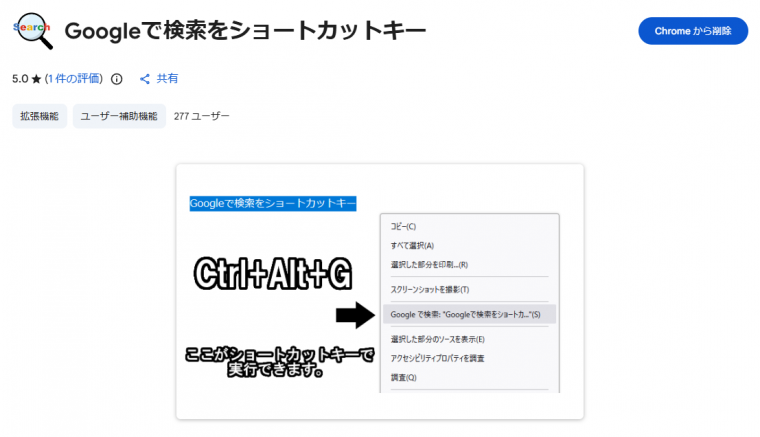 もう一つ便利だと感じたのは「Googleで検索をショートカットキー」という拡張機能です。これはその名のとおり、通常ではショートカットキーが割り当てられていない、Google検索をショートカットキーで実行できるもの。