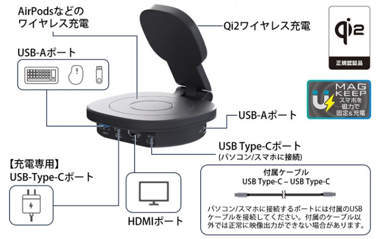 本製品は、Qi2ワイヤレス充電機能に加え、外部ディスプレイへの映像出力やUSB 5Gbps対応USB-Aポート×2などの拡張機能を搭載した4in1ドッキングステーションです。