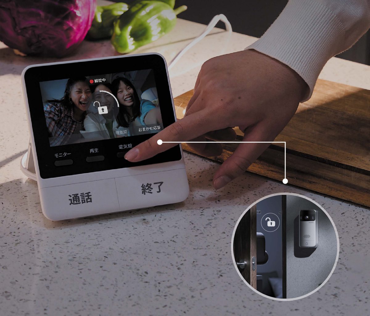 ベルが押されたら録画を開始、Wi-Fi接続でスマホからも応答できる。室内機およびスマホからいつでもリアルタイムに玄関先の確認も可能。カラーナイトビジョン機能により夜間も鮮明に録画する。災害情報の表示機能も搭載。