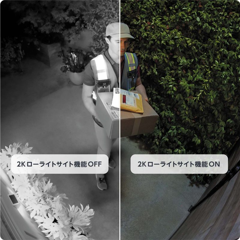 AIが人物・車両などを検知すると2Kの高精細高画質で録画を開始する。ローライトサイト機能により、夜間のわずかな明かりでもカラー映像を録画できる。録画は有料プランに加入することでクラウドに保存、スマホから確認できる。