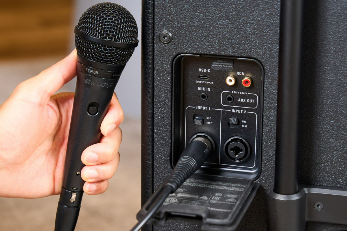 車輪とハンドルで簡単に移動でき、バッテリー駆動により電源コンセントの位置に縛られないのもポイント。楽器入力端子を活用すれば、生演奏と組み合わせたパフォーマンスも可能です!