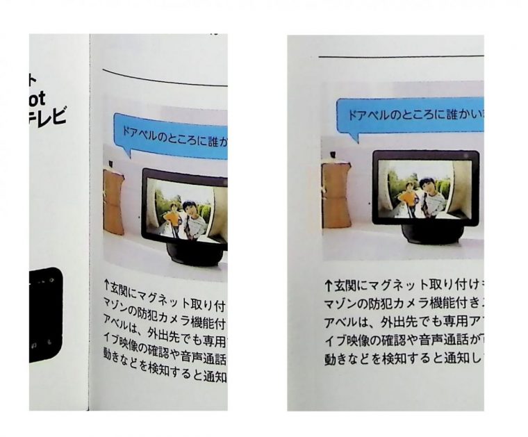 上の写真のように、なにもない位置に指サックを当てれば完璧に消去してくれる一方、文字や写真のある場所を押さえてしまうと、やはり不自然になるので、小口(ページ外側の端)ギリギリまで文字や写真があるものには不向きです。