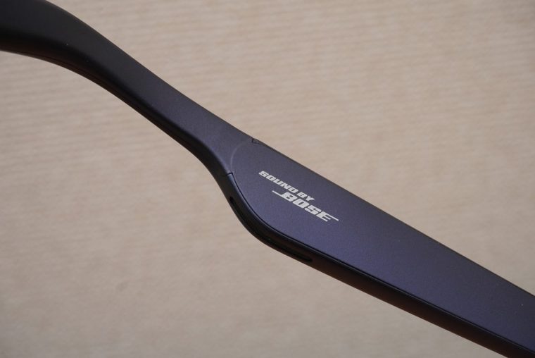 スピーカーはオーディオブランドのボーズがサウンド監修をしており、左側フレームの左内側に「Sound by Bose」のロゴがプリントされています。オーディオに関しては本体に特別な設定項目はなく、音量のアップダウンのみ調整可能です。かなりパワフルなサウンドが楽しめる一方で、最近人気のオープン型イヤホンに比べると“音もれ”があります。音付きのコンテンツを視聴する際には周囲の迷惑にならないように気をつける必要があるでしょう。
