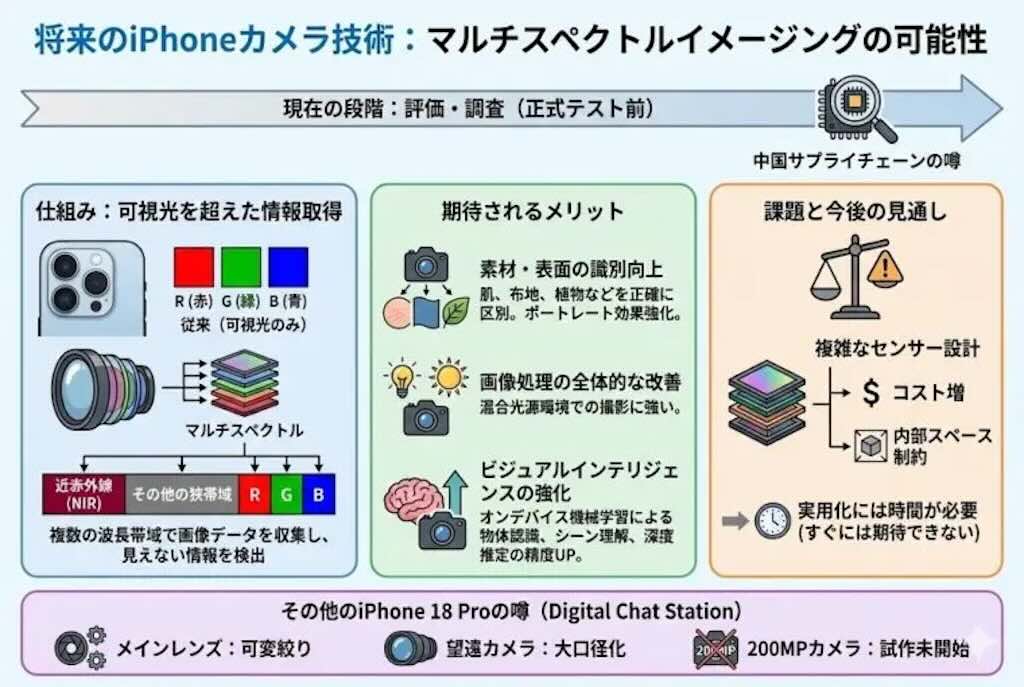 リークアカウントのDigital Chat Stationによれば、iPhoneのカメラには「マルチスペクトルイメージング(多波長撮像)」の導入が検討されているそう。これにより、「ビジュアルインテリジェンス(Visual Intelligence)」の向上、素材検出の強化、および画像処理の改善が期待されています。