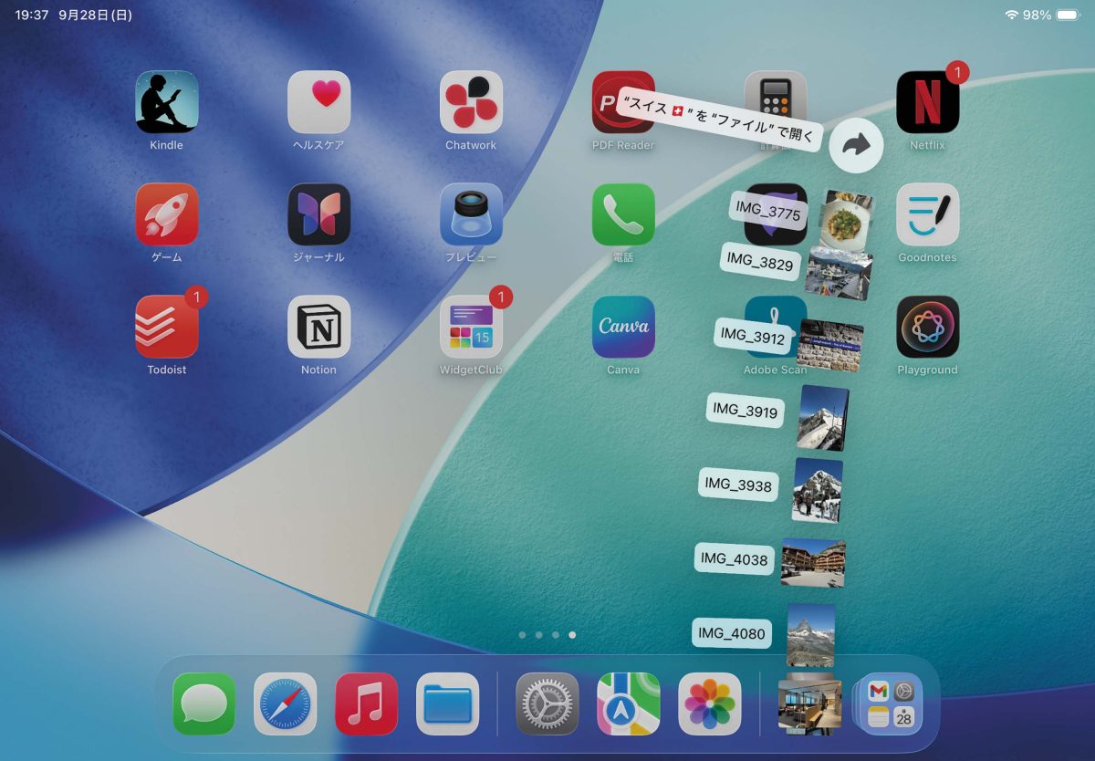 「Liquid Glass(リキッドグラス)」は、すべてのApple製品に共通となるデザイン基準。もちろんiPadOS 26でも適用される。画面上で見ている写真や映像、文章などのコンテンツを引き立てるのが目的だが、これまでのフラットデザインと比較して美しく、そして見やすくなったのが特徴だ。