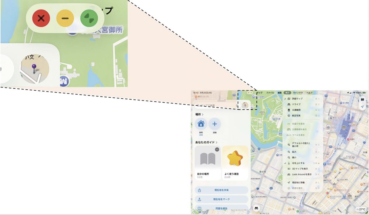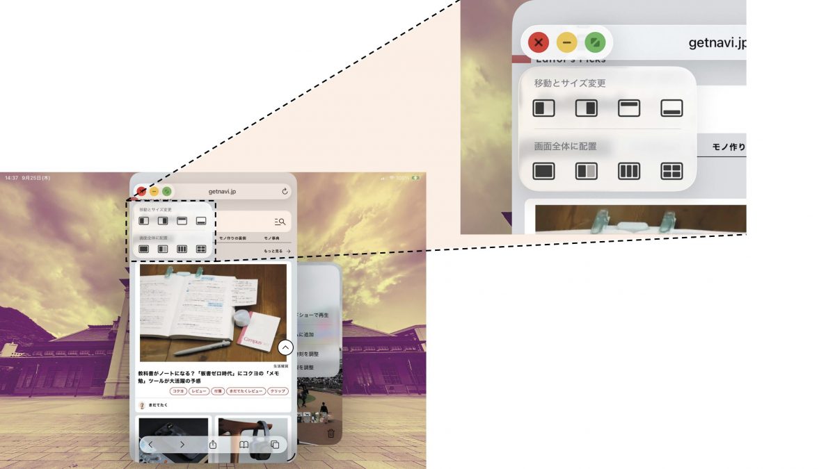 これまでiPadでは画面下から上へのスクロールが“使用中のアプリを終了させる(切り替える)”ことだったが、Mac同様に「×」をタップすることで終了できるようになった。アプリの最小化や最大化も可能だ。またメニューバーから必要なコマンドを素早く選べるようになった。