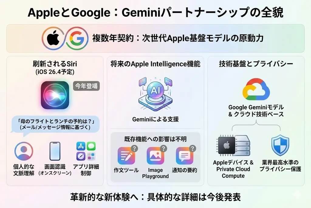 両社は今後リリースされる「よりパーソナライズされたSiri」や、AI機能の「Apple Intelligence」において、数年間にわたり協力することになります。これにより、次世代の「Apple Foundation Models(Apple基盤モデル)」はGeminiにより構築されます。