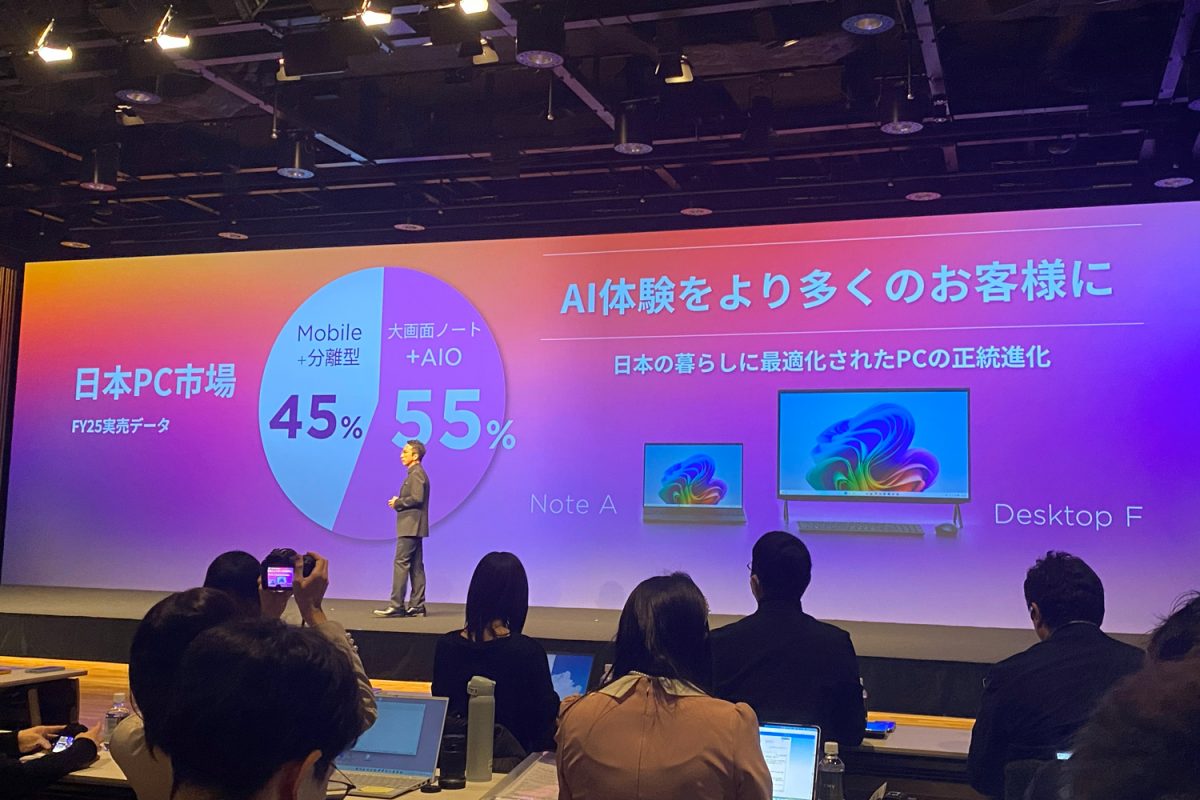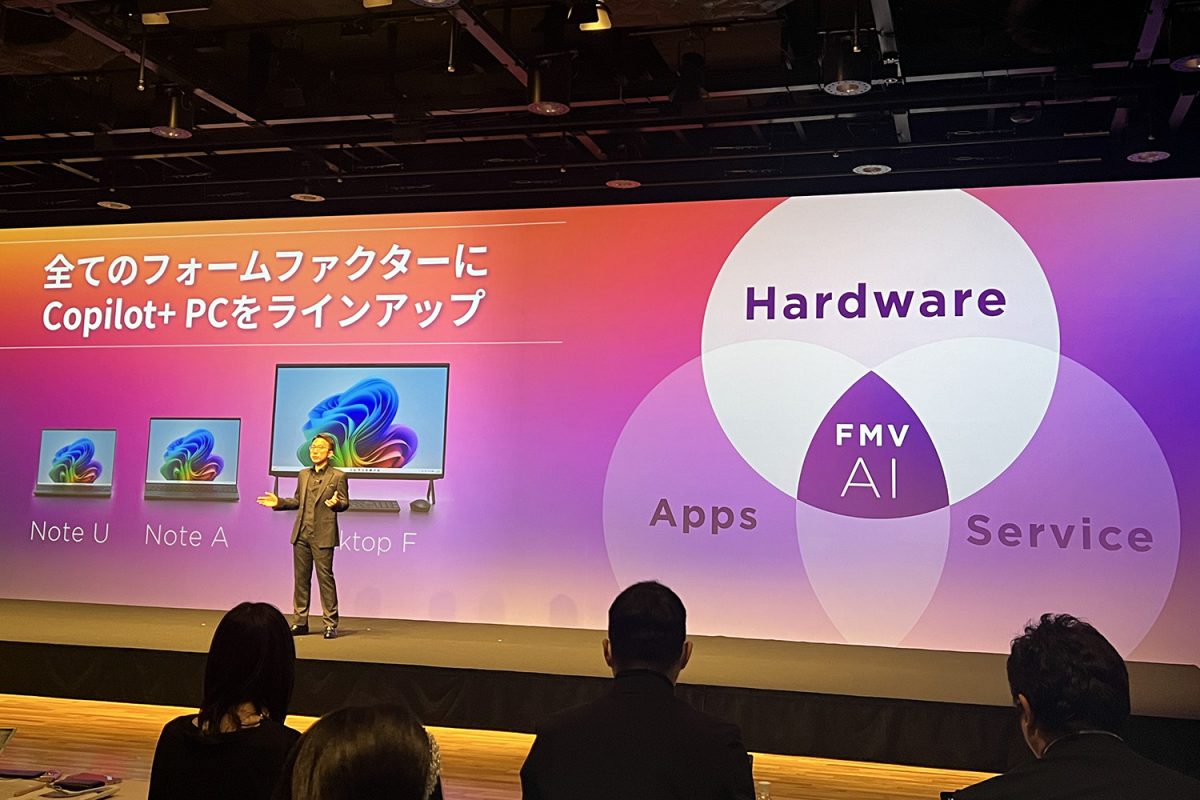 「モバイルPCが活況な一方で、日本国内PC市場の実売データを見ると、大画面ノートPCや一体型デスクトップPCをお買い求めになるお客様が約半数ほどいらっしゃいます。FMVはCopilot+ PCのAI体験を、(大画面ノートPCやデスクトップPCを含めて)より多くのお客様に届けてまいります」と説明しました。