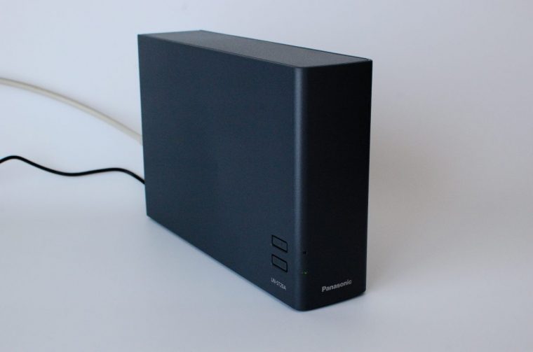 miyottoの本体サイズは幅5.5cm、高さ14.7cm、奥行き21.45cmとコンパクトで、レコーダーというよりは無線LANルーターのような佇まいです。デザインもシンプルで、側面に設定用のボタンが2つあるのみとなっています。