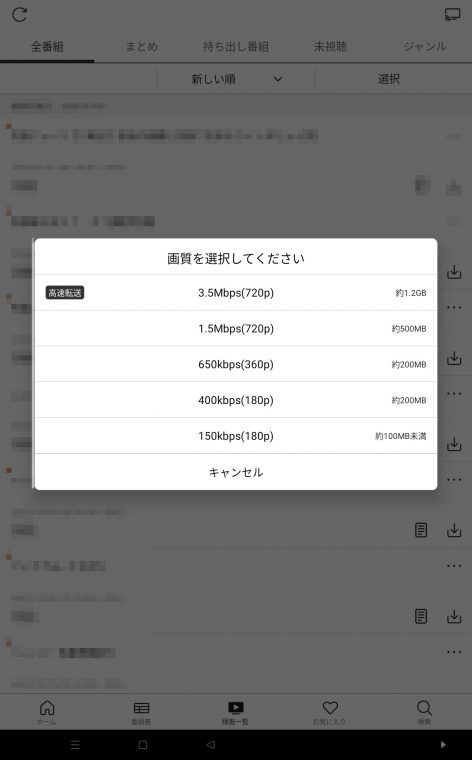 ダウンロードに要する時間は短め。通常の転送に加えて「高速転送」という機能があり、これを使って45分間の番組を最高画質(3.5Mbps/720p)で転送してみたところ、約6分で完了しました。このくらいなら、出かける前にちょっと操作するだけで数時間分の番組を持ち出せそうです。