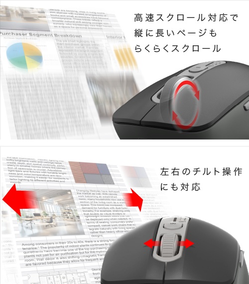 滑らかな感触でシームレスに回転する高速スクロールホイールを搭載。チルトボタンも搭載しているため、スクロールホイールを左右に倒すことで横スクロールも可能です。数千行に及ぶExcelシートや、縦に長いWebページの閲覧・校閲に便利な、仕事効率の向上が期待できるマウスです。