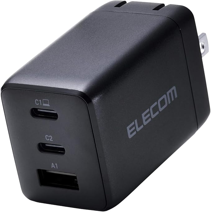 EC-AC10367BKは、USB-C×2/USB-A×1の3ポートを備えた急速充電器。USB-Cポート単一使用時には最大67W出力、2ポート同時使用時は最大45W出力、3ポート同時使用時は最大40W出力での充電が可能です。