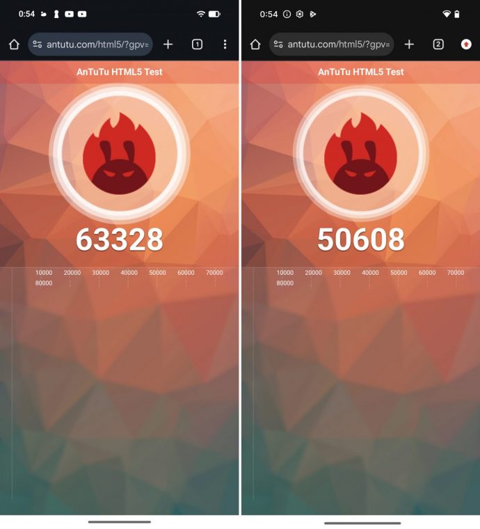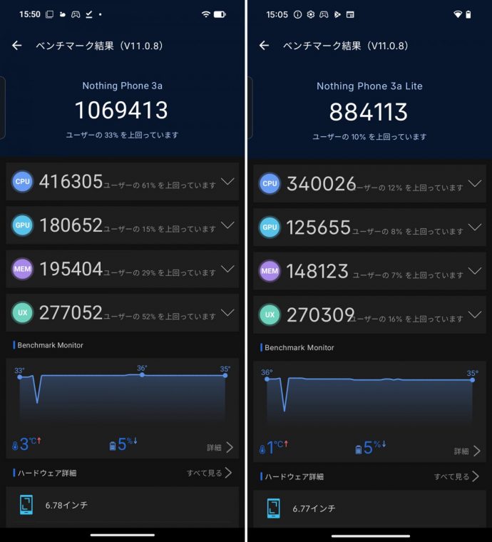 AnTuTuベンチマーク(V11)のスコア結果がこちら。Phone (3a) Liteは100万に届かない一方で、Phone (3a)はなんとか100万に達しています。ディスプレイやカメラ性能ではそれほど大きな違いはありませんでしたが、スペックはその限りではなさそうですね。