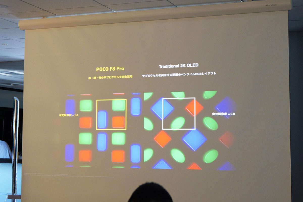ディスプレイは約6.59インチの有機ELで、解像度は1.5K(2510×1156ドット)。特徴的なのは、赤・緑・青のサブピクセル構造を採用していることで、これにより、2K解像度相当の精細さと色鮮やかさを実現しているといいます。それでいて、消費電力は前世代から22.3%下がっているとのこと。