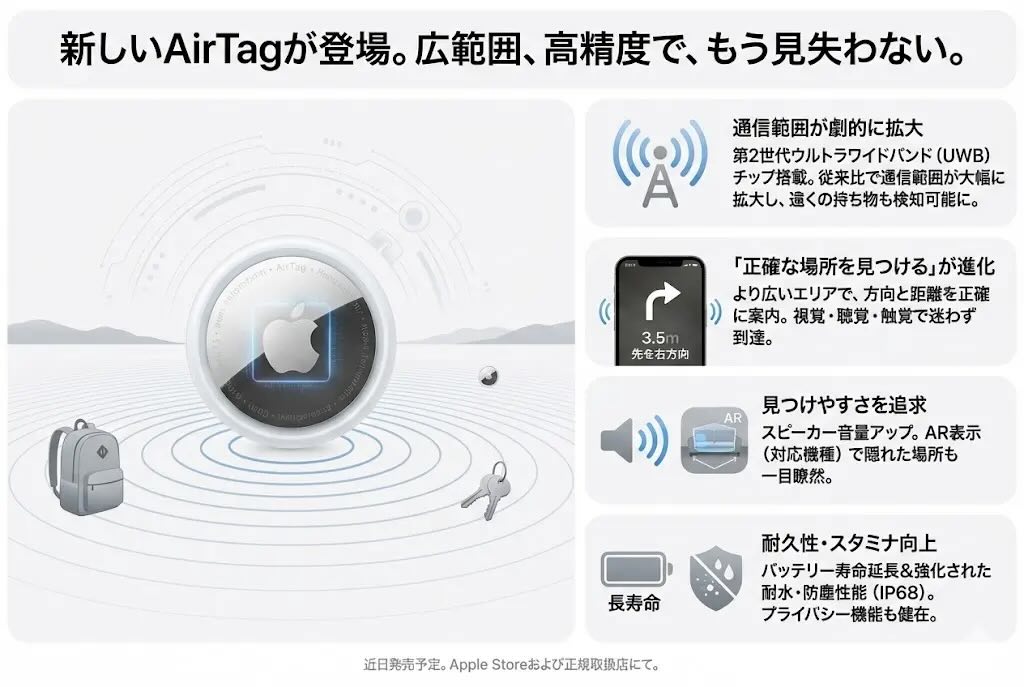 さらに、このAirTagでは「Apple Watch Series 9」以降、または「Apple Watch Ultra 2」以降で「正確な場所を見つける」機能が使用可能。スピーカーの音量が50パーセント大きくなり、これまでより最大2倍離れた場所からAirTagの音を聞き取ることができます。