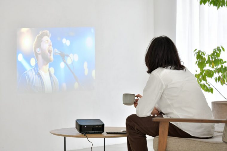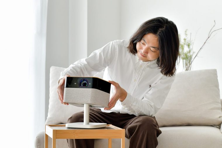 ところが最近のプロジェクターは、デザインが本当に洗練されているんです。特に今回ご紹介するエプソンのEF-60/70シリーズは、まるでインテリア雑貨のような佇まい。操作ボタンが天面にないデザインで、リビングに置いても寝室に置いても、空間に自然になじみます。