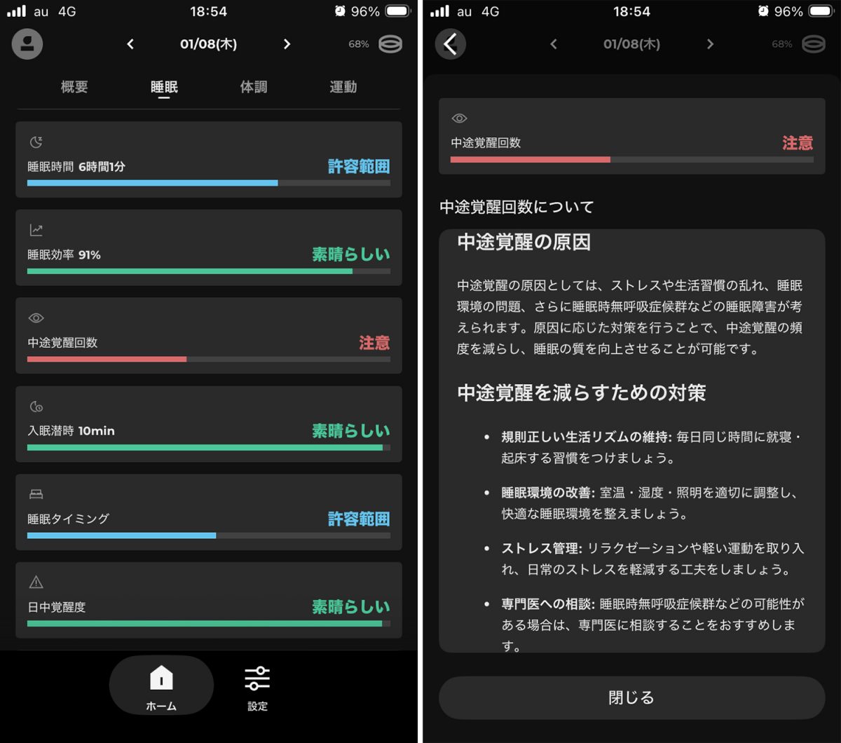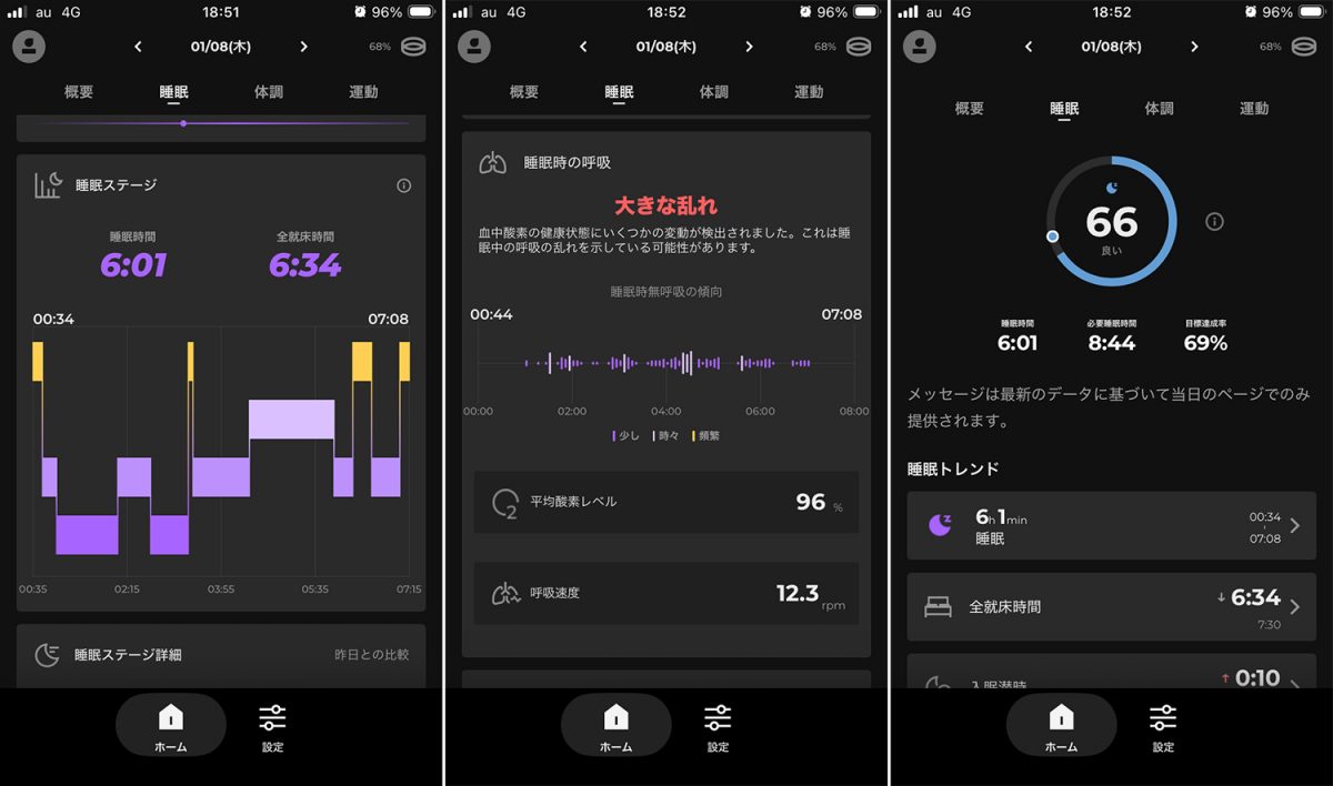 睡眠に関するデータは豊富に取得可能。改善方法の提示も好印象