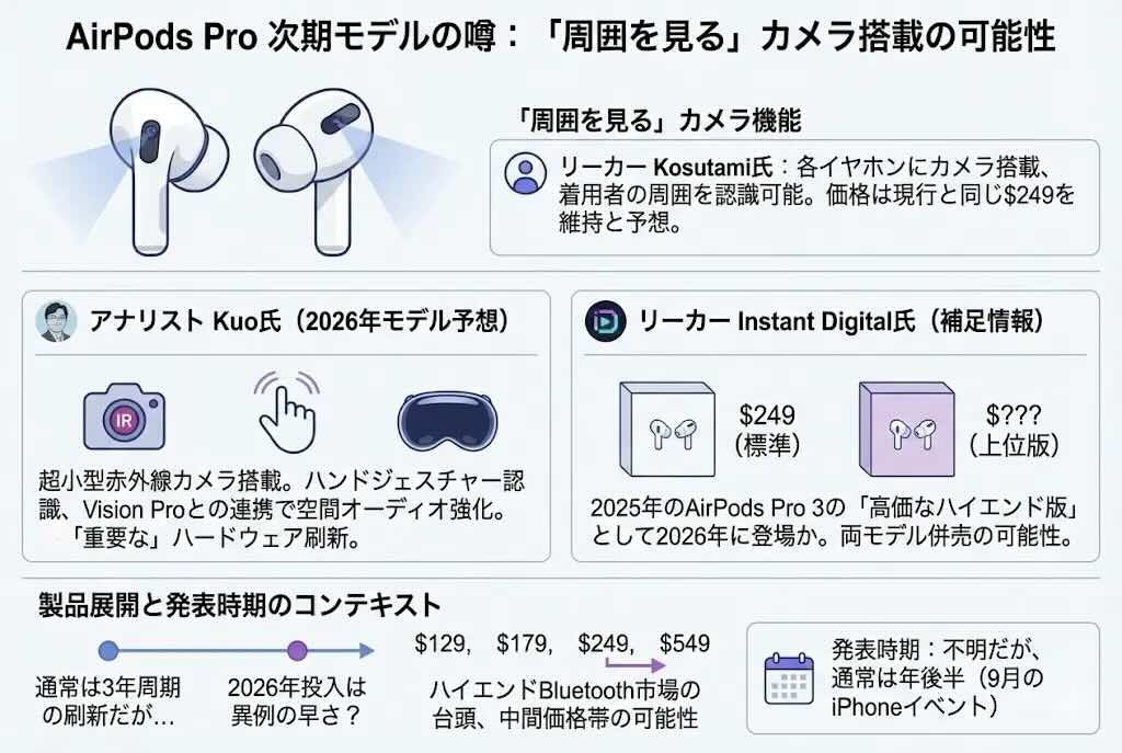 また、リークアカウントのInstant Digitalも、次期AirPods Proに赤外線カメラが搭載されると発信していました。現行モデルのAirPods Proよりも高価で、両モデルが並行して販売される可能性もあるようです。