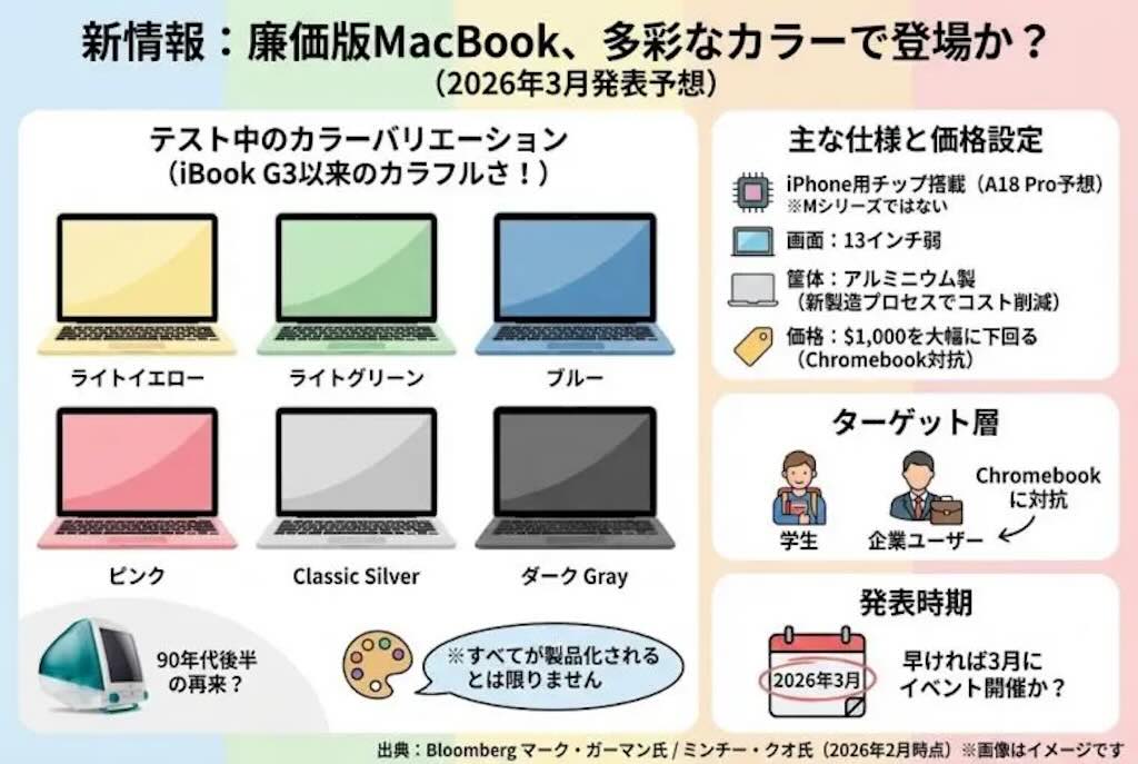 米ブルームバーグのマーク・ガーマン記者によれば、廉価版MacBookではライトイエロー、ライトグリーン、ブルー、ピンク、クラシックシルバー、ダークグレーがテストされているとのこと。ただし、これらすべてが製品化される可能性は低いとも述べています。