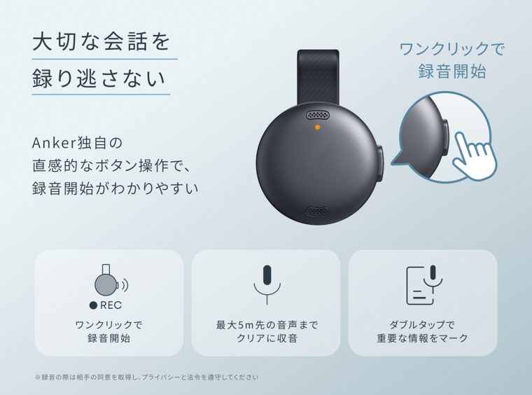 本製品は、会議や商談、インタビューなどの音声をワンクリックで録音し、AIにより自動で文字起こしから要約までを行うことができるAnker初のウェアラブルAIボイスレコーダーです。わかりやすく直感的な操作にこだわり、マイク側面のボタンを押すだけで簡単に録音を開始することができます。